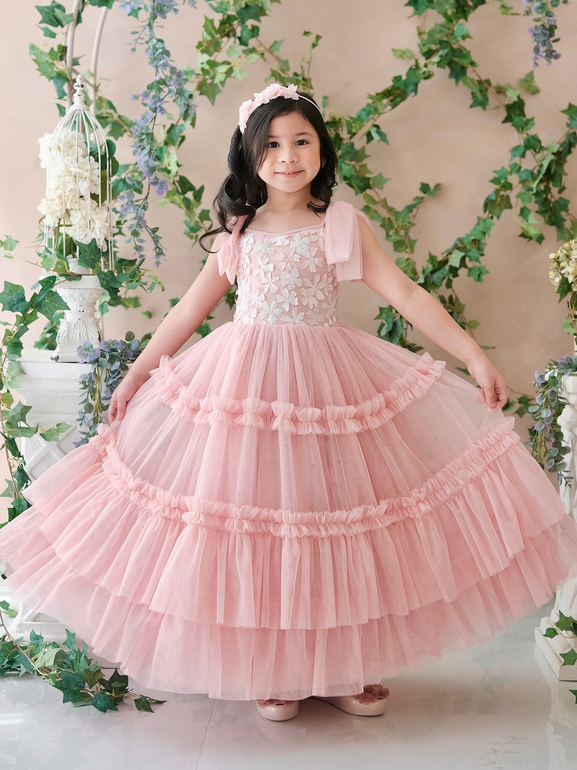 The Imogen Dress is our blush-pink masterpiece that's crafted from premium materials such as cotton lining, stretch crepe, and embellished tulle, turns every twirl into a blossom-filled daydream. Soft petals bloom across the bodice, while tulle bows at the shoulders add a whimsical touch. Voluminous layers of gathered tulle and ruffles create a skirt perfect for weddings, parties, or garden frollicking.