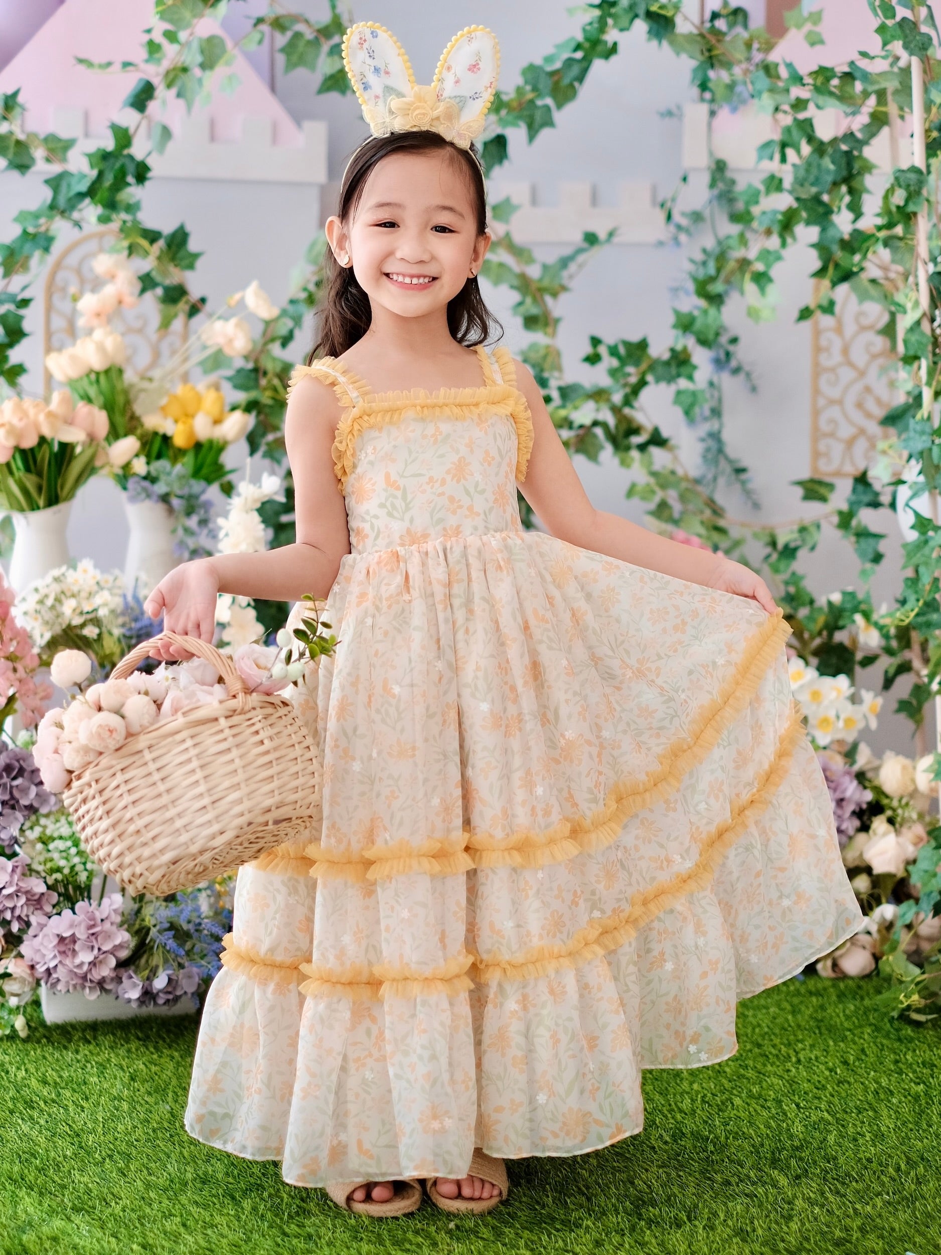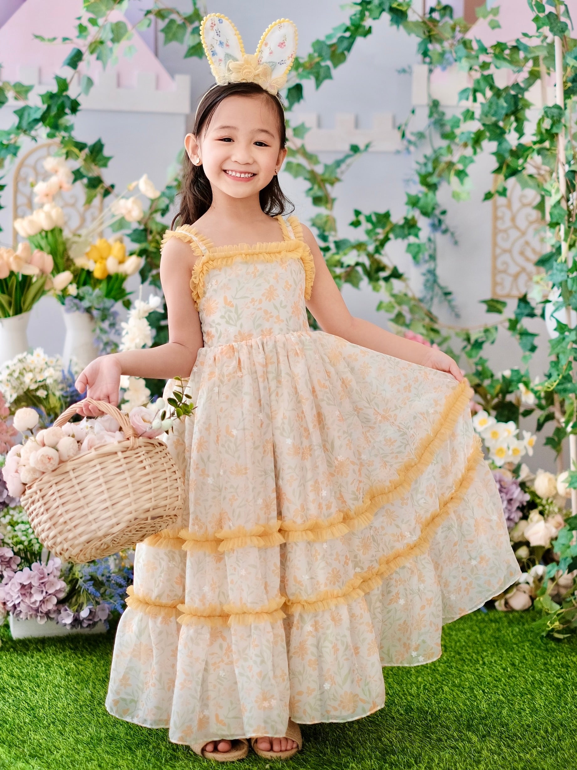 Estimated ship-by-date for pre-order : February 7, 2026 |The Ingrid Dress is a showstopper in vibrant yellow floral organdy that captures pure joy. Featuring delicate soft tulle ruffles across the neckline and shoulders, adding whimsical dimension and movement. The maxi silhouette features ruffles that twirl with every step, creating an enchanting, springtime look.