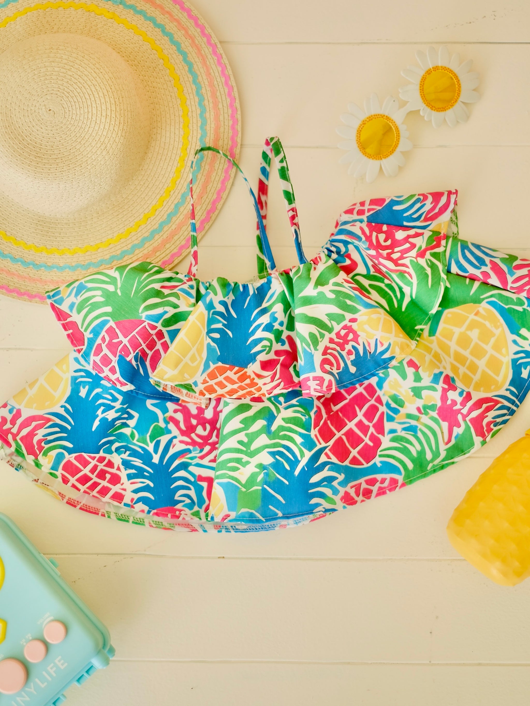 Rock that tropical vibe with the Nana Pineapple Top—a playful burst of sunshine that's as fun to wear as it is to look at. The bold, bright pineapple print pops against the billowy two-tier silhouette, while the clever criss-cross back strap adds an unexpected twist. Elasticized chest keeps everything comfy, and you can style it two ways: strap it traditionally or flip it to the front for a cheeky surprise. Perfect for little adventurers ready to make a statement.