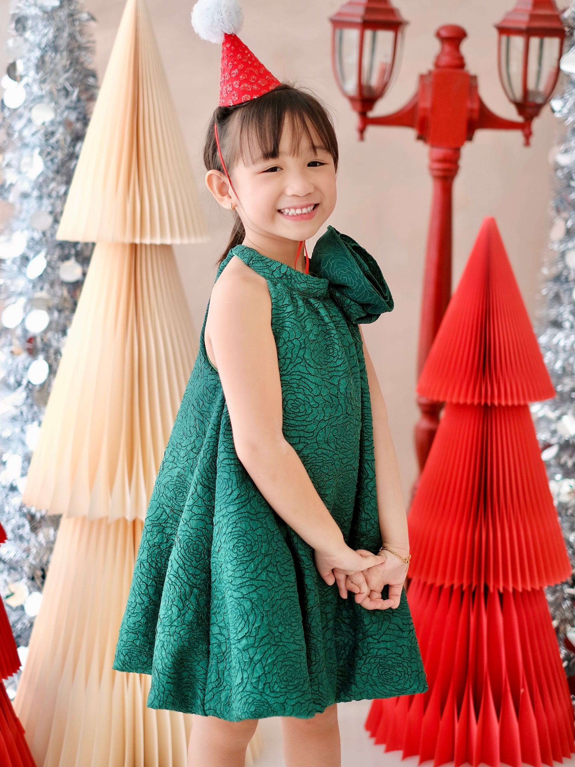 Introducing the Palma Bubble Dress in Green Jacquard – a playful twist on our fan-favorite silhouette! This charming piece features intricate jacquard detailing adorned with a delicate bow, all wrapped in a flattering bubble hem. The rich hunter green hue is absolutely stunning, while the soft cotton lining keeps you comfortable all day long. Perfect on its own or paired with our Henriette Skirt for a coordinated look.