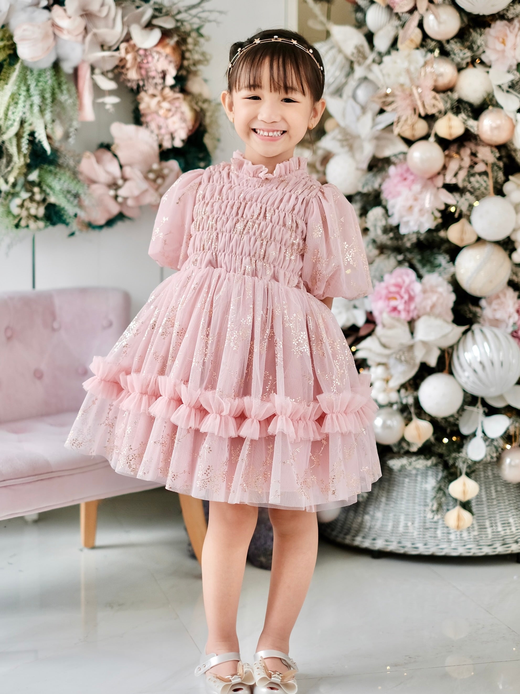 Elevate your holiday wardrobe with our Sabrina Mini Dress in shimmering rose gold and blush! This festive reimagining of a customer favorite features a charming smocked bodice and delicate ruffled neckline crafted from layers of soft cotton and tulle. The playful frilly skirt detail adds movement and whimsy, making it perfect for celebrations and special occasions. A sparkling twist on timeless elegance.