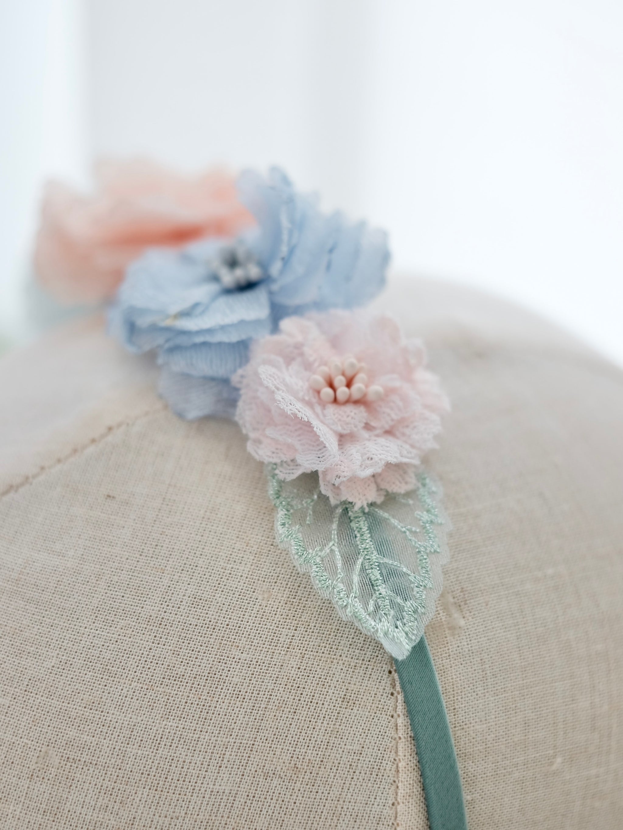 Fabric flower headband in peach, sage, baby blue and baby pink. Made to match our tutu dresses in pastel colors