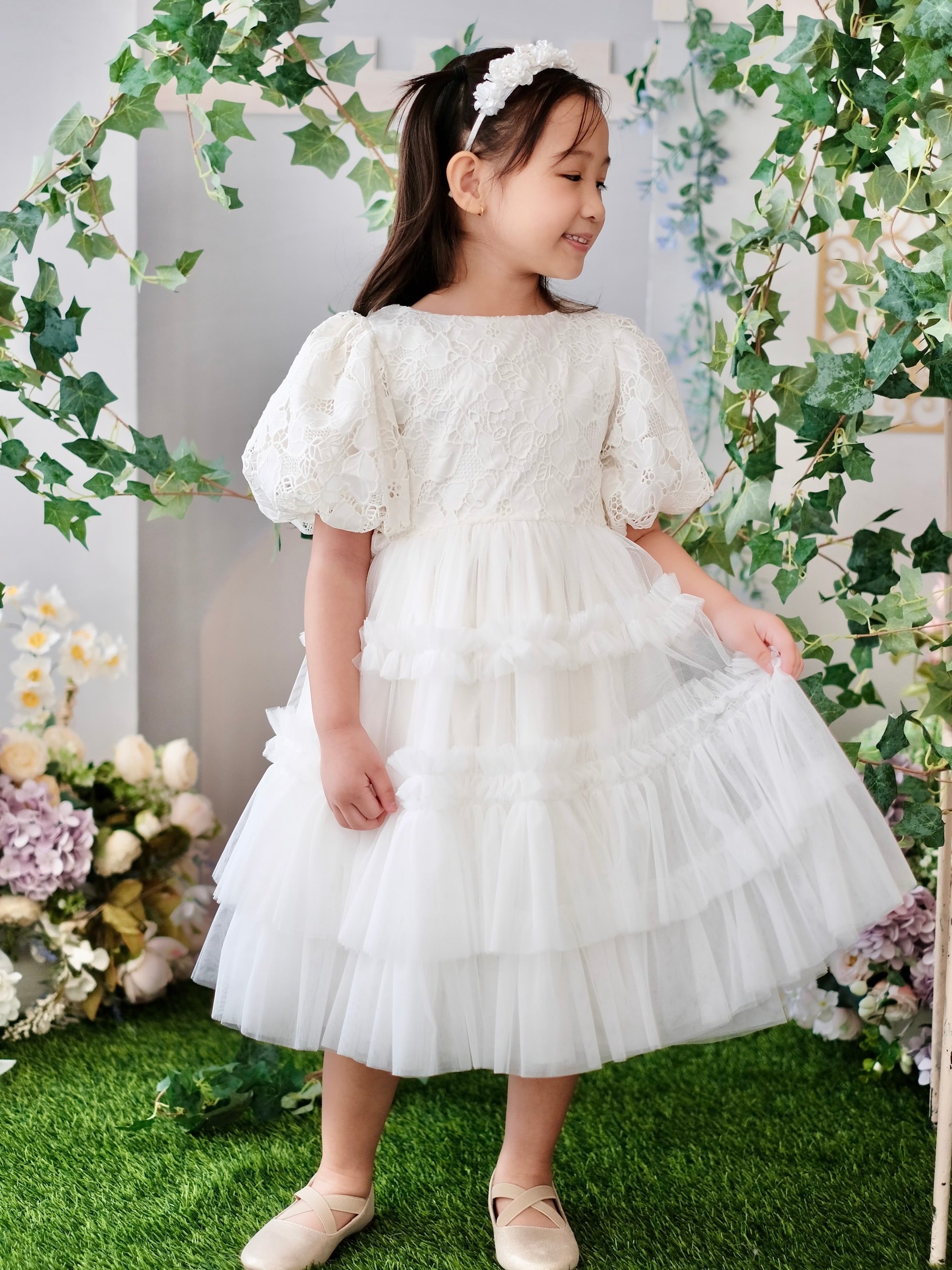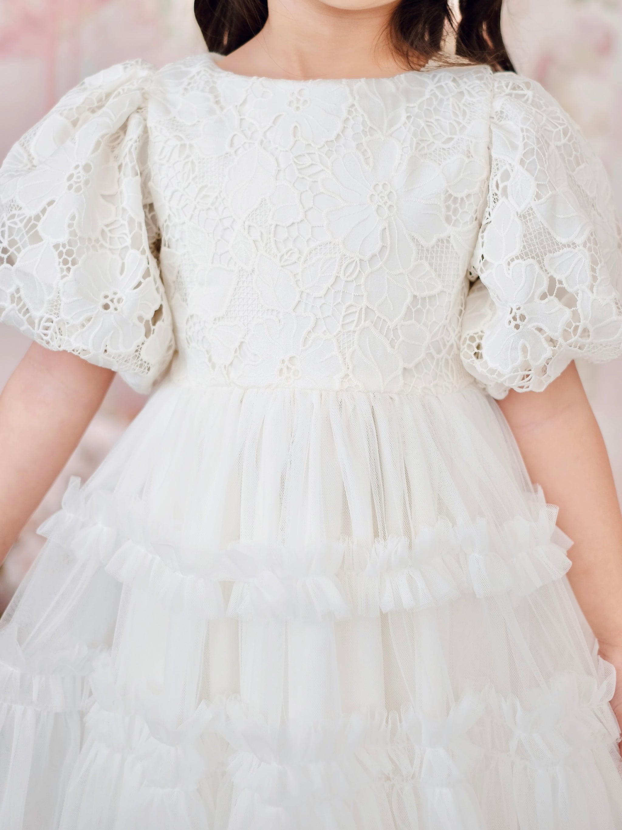 Let your little one twirl in style with the Bellerose Long Midi Tutu Dress—a charming piece that blends elegance with fun! The soft off-white skirt floats beautifully with every movement, while the delicate floral-embellished bodice adds a touch of refined grace. Crafted from tulle fabric, with cotton lining and prada lace bodice.