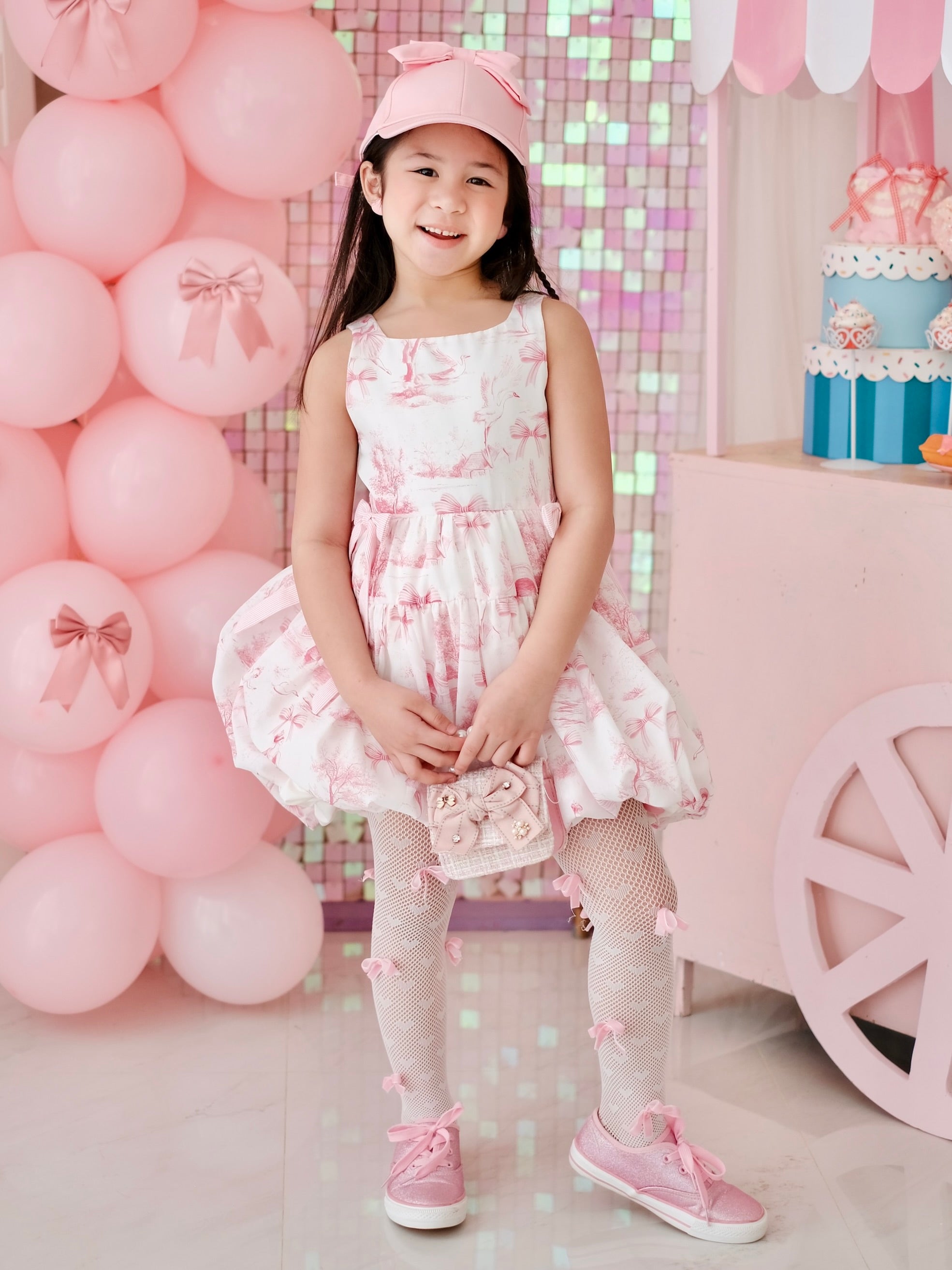 The Sandrine Bubble Dress in charming pink toile features delightful pink bows, adding a touch of bow-tiful flair. Adjustable pink side sashes let you cinch the waist to for a perfect fit, creating a flattering silhouette that's as fun as it is fabulous. Perfect for those who love a pop of pattern and playful details!