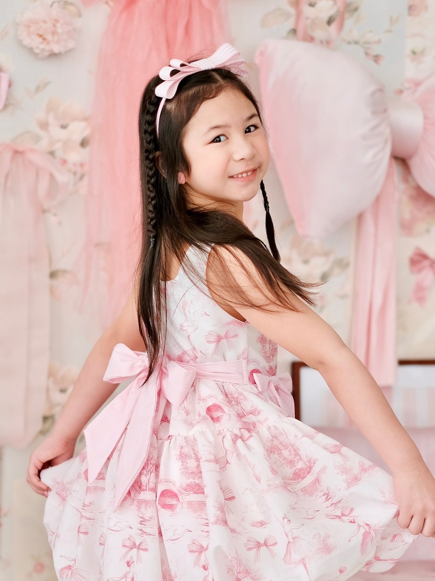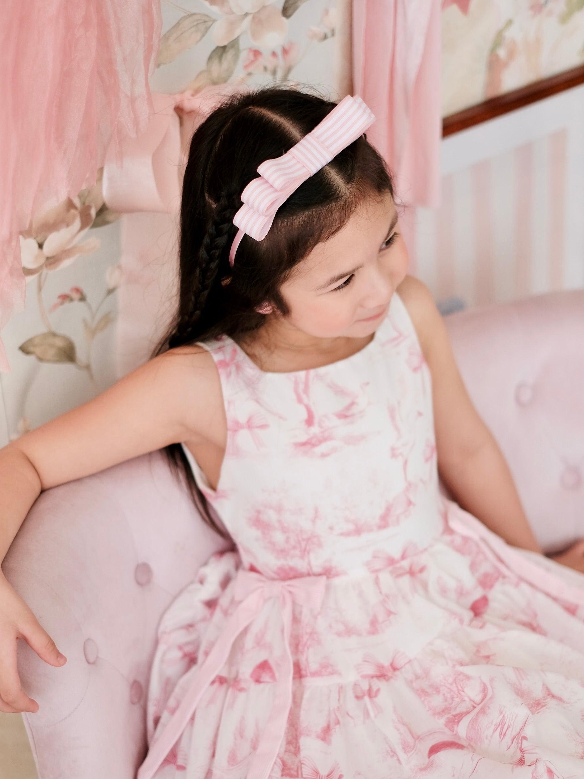 Rock this adorable pink striped bow headband and pair it with the Sandrine Bubble Dress in pink toile for a coordinated look that's bursting with charm. This playful accessory is the perfect finishing touch to complete your outfit, keeping your hair secured while adding that extra dash of fun and personality. Mix, match, and make it your own!