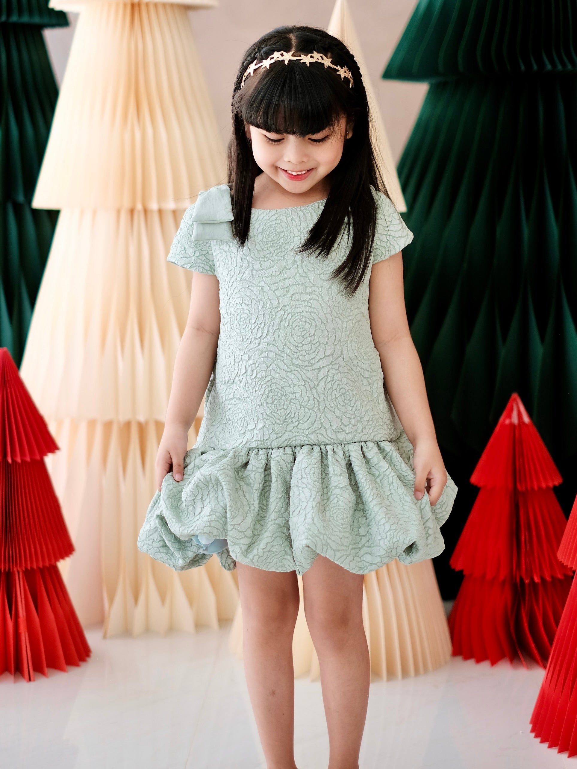 This playful shift dress features cap sleeves with charming bow accents, a bubble skirt, and a fully lined interior crafted from soft cotton. Made with sophisticated jacquard fabric, the Fleurine Dress in sage combines comfort with a fun, flirty flair.