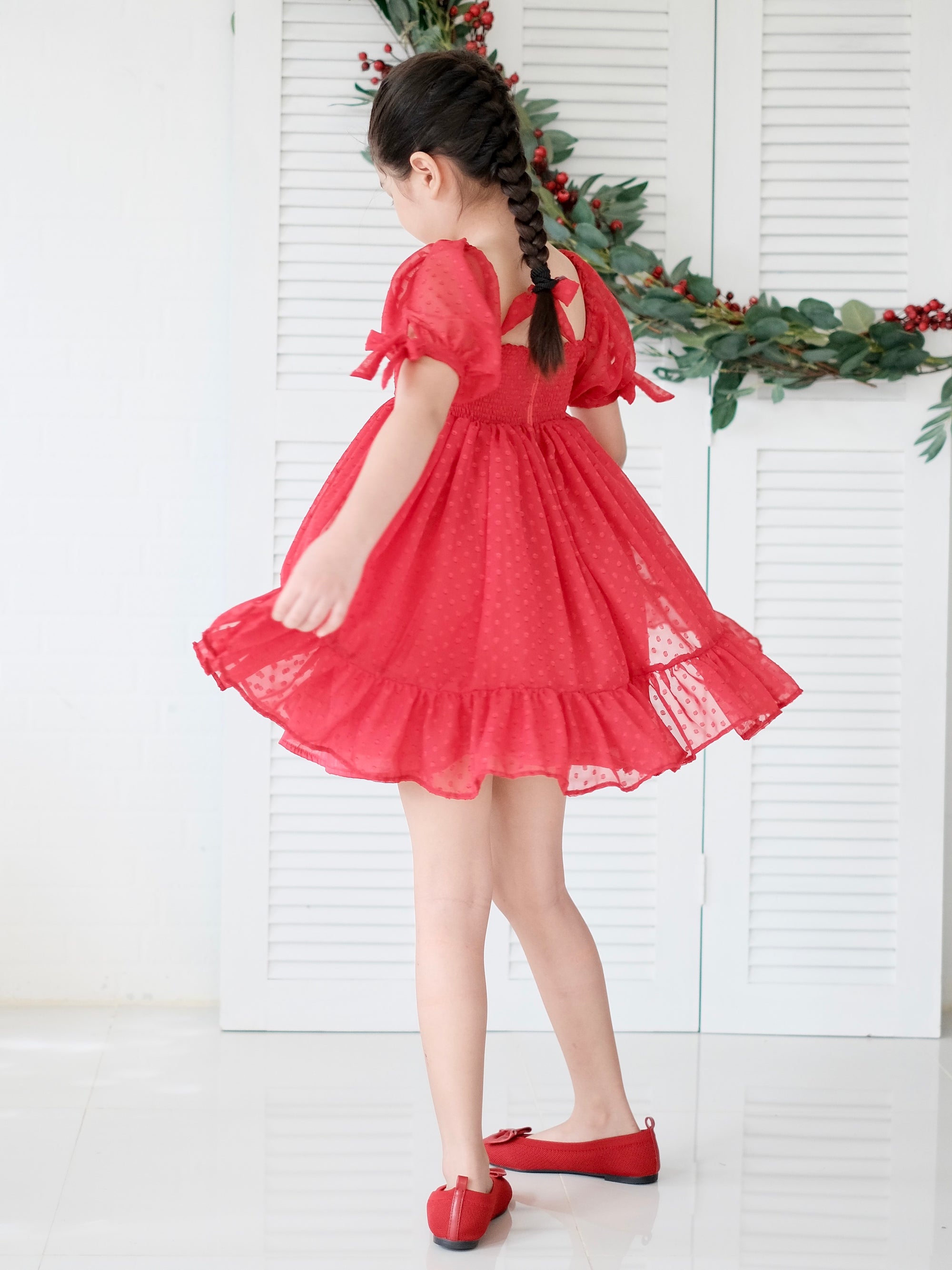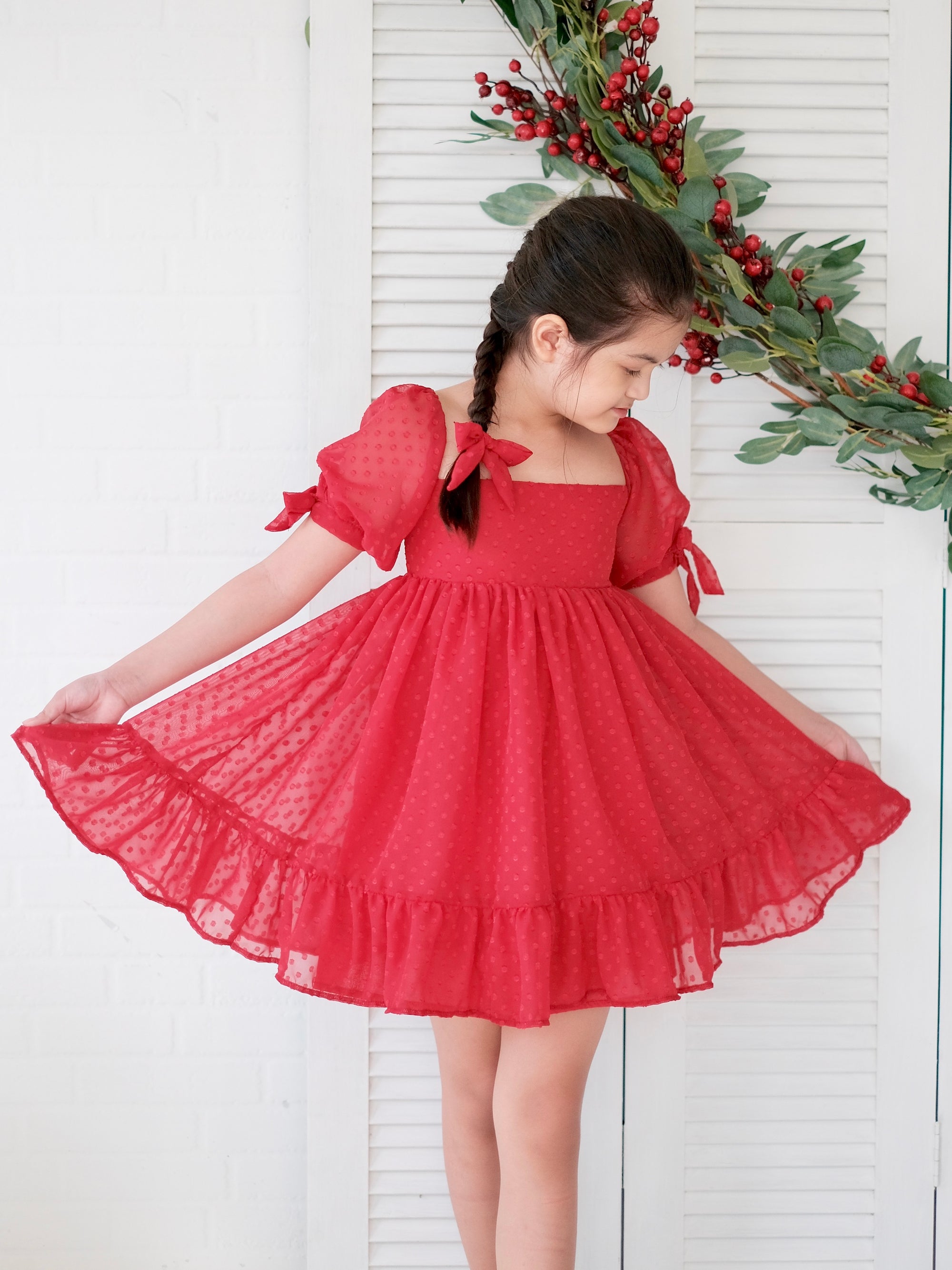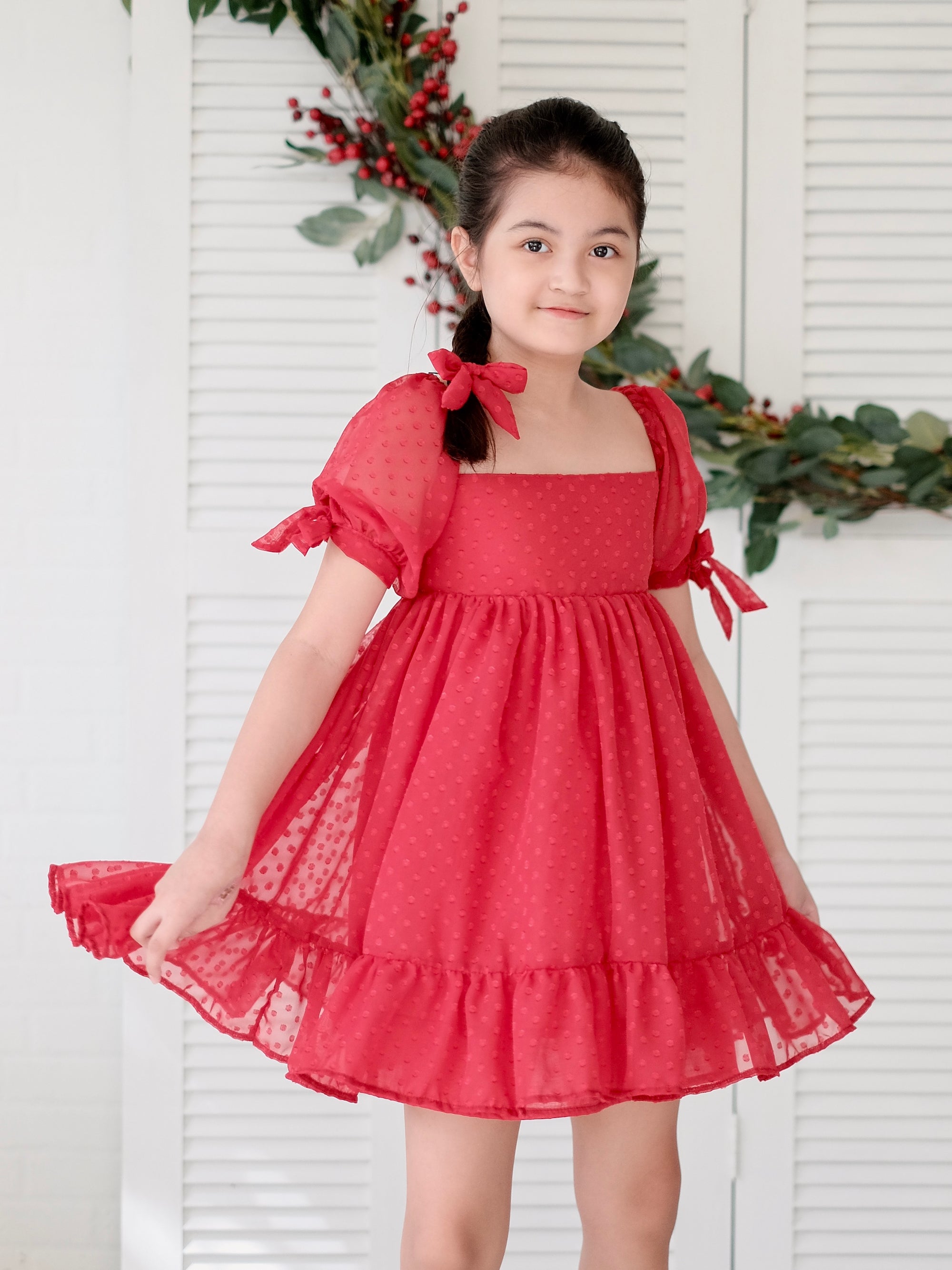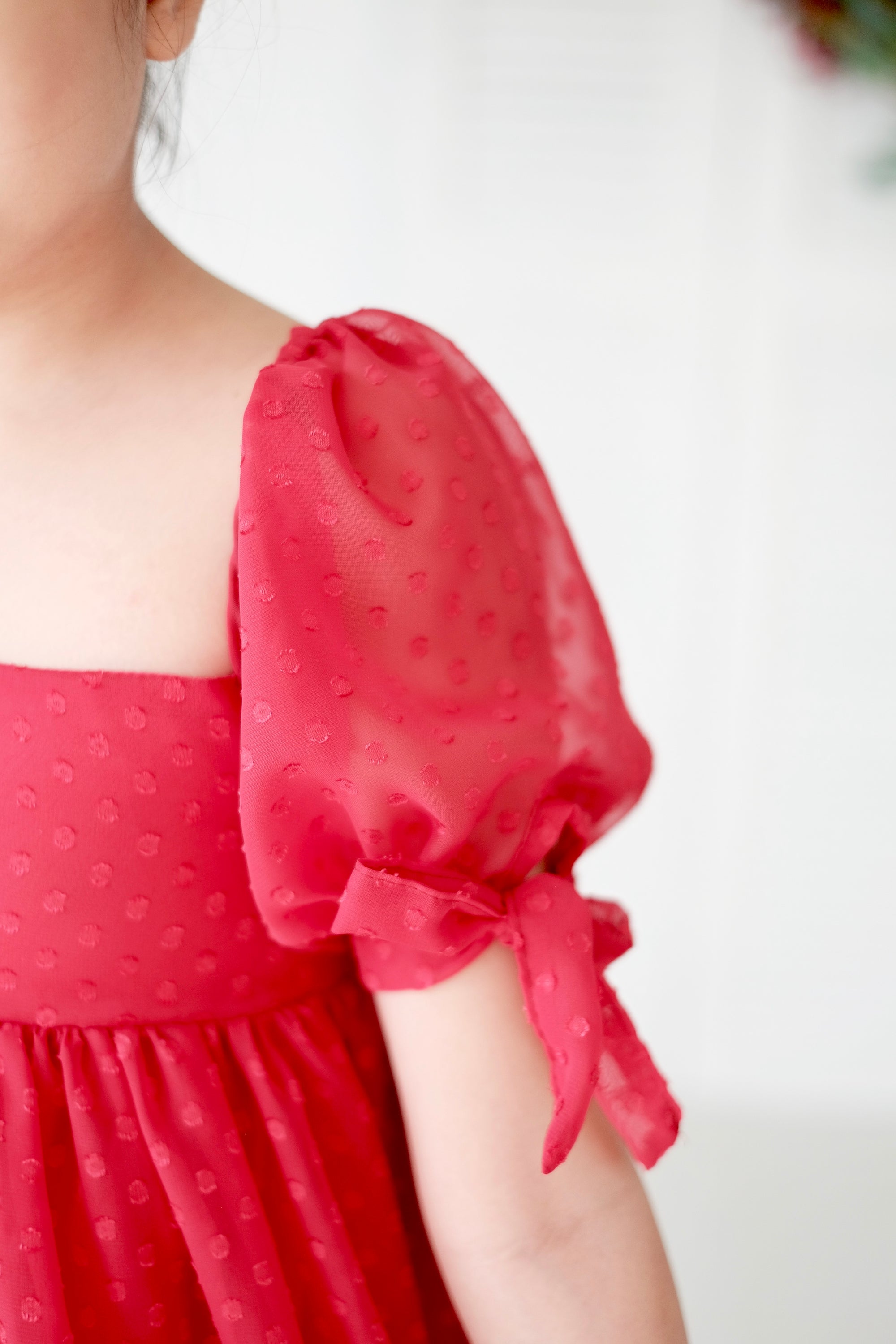 Mini doll dress crafted from sheer swiss dot fabric with cotton lining.